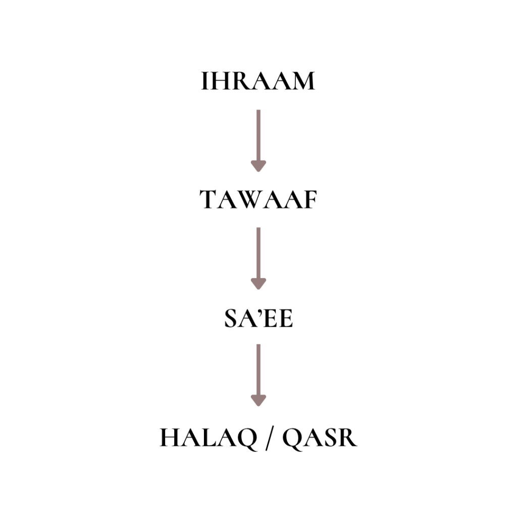 1. Ihraam (i.e. special dressing, niyyah and talbiyah).